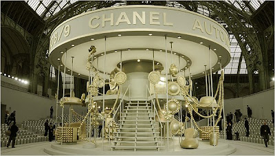 The first time I saw photos of the most recent Chanel show I was disappointed. Funny because I count on death, taxes and Lagerfeld. The giant set did not make any sense to me whatsoever and left me flat. Well for some reason I just visited the Chanel site. Upon closer inspection I just and realised what the set depicts. It is an enormous couture merry go round. Lagerfeld said he decided to put the house's historical motifs on to the merry ground so that he could free himself to work with the clothing unadorned of the usual pearls and camelias. But...